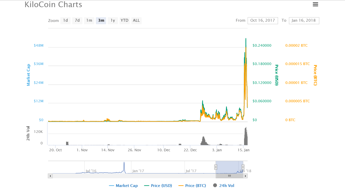 In August 2017, KiloCoin was trading at $0.000317 while its market cap was in the range of $57,000. In the past three months, everything has changed for the better. This can be attributed to the ripple effect of the good performance of Bitcoin. In December 26th, the coin reached a price of $0.022 and a market cap of over $4.4 million. The price has since surged to reach $0.29 and a market cap of $9 million.
